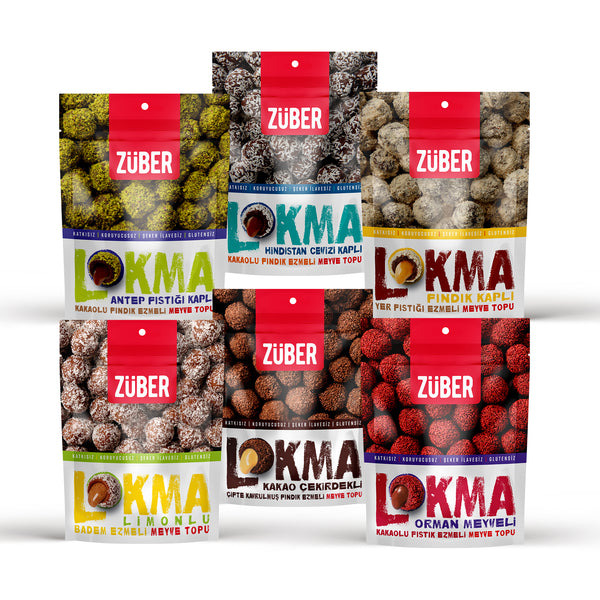 Her damak tadına uygun bir çeşidi bulunan lokmaların her bir paketi, farklı bir lezzeti öne çıkarıyor, Züber lokma meyve topları lezzetiyle insanı mest ediyor. Dışı çeşitli malzemelerle kaplanan ve içi de farklı akışkan ezmelerle (fındık, badem veya yer fıstığı ezmesi) doldurulmuş bu hurma topları, besleyici ve lezzetli atıştırmak isteyen herkesi bekliyor.